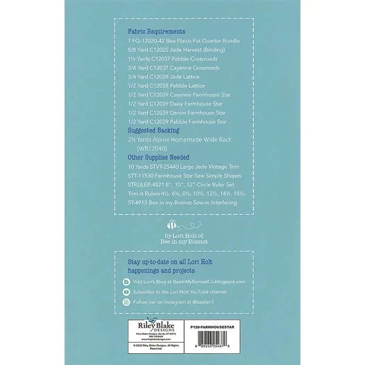 The Farmhouse Star Quilt by Lori Holt of Bee in my Bonnet features appliqued stars using Lori’s Farmhouse Star Sew Simple Shapes (STT-11530) and her Bee Plaids Collection. Finished size is 78″ x 78″.