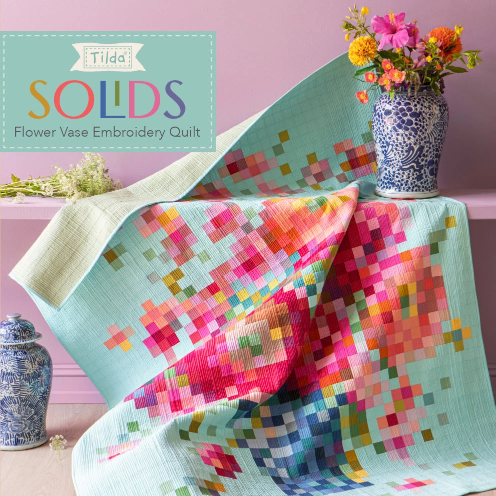 Flower Vase Quilt Kit featuring Tilda Solid Basics- quilt finishes at 63.5 x 81.5″ and includes all fat-quarters, fat-eighths and additional yardage needed for the quilt top and binding. Our fat-quarters are cut at 10″ and our fat-eighths are cut at 5″ to give you PLENTY to work with! We have (2) background options that include Tilda Solid Basic-Dove White and Tilda Solid Basic-Sky Teal as well as an option to add the TenSisters Grid Paper for faster sewing! The featured picture uses the Tilda Solid Basic in Sky Teal.