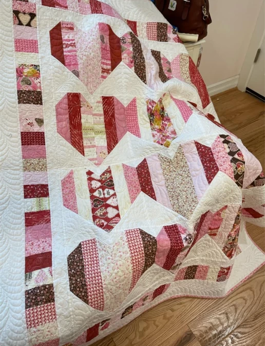 Black Mountain Needleworks, Heartstrings- This adorable quilt is QUICK and EASY with precut 2-1/2″ jelly roll strips (or twelve 1/4 yard cuts). Finished size 56in x 68in