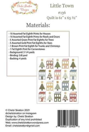 Chelsi Stratton Designs, Little Town- 61×65.5″ finished quilt; Charming cottages and towering pine trees combine to create the Little Town Quilt Pattern. Collect a seasonal selection of festive fat eighths and enjoy decking the halls with this cheerful Christmas quilt.