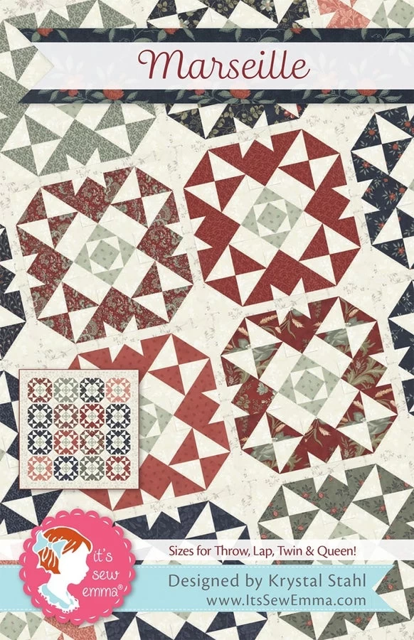 It’s Sew Emma, Marseille- Today is the day to explore Marseille, at least with fabric! A classic star is given a stunning makeover with added flourishes for a vivacious new quilt. This fat quarter-friendly design is offered in four size options to cover all your quilting needs. If you want to use foundation paper, we recommend using 3″ Half Square Triangle Paper (#H300).