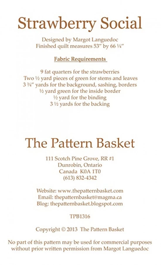 The Pattern Basket, Strawberry Social- quilt finishes at 53×66″