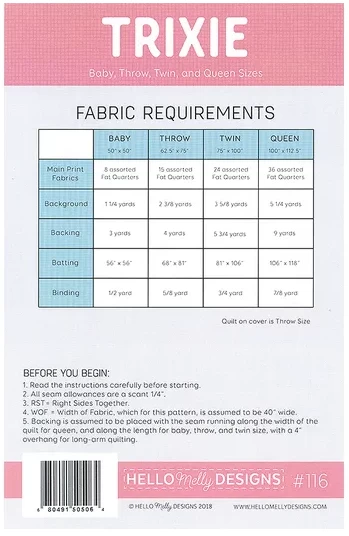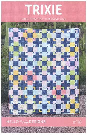 Riley Blake Designs, Hello Molly Designs, Trixie- a beginner-friendly pattern made of one simple block that repeats to make a cool interlocking block effect! This fat-quarter quilt pattern is fully illustrated and easy to follow. Sizes included are Baby (50″ x 50″), Throw (62 1/2″ x 75″), Twin (75″ x 100″), and Queen (100″ x 112 1/2″).