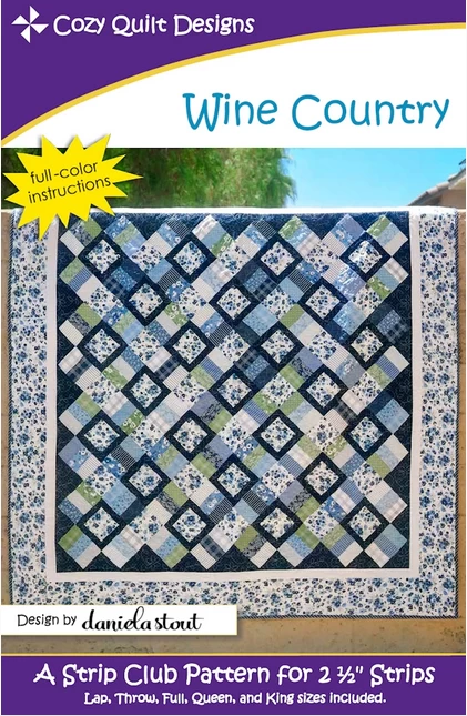 Cozy Quilt Designs, Wine Country- pattern uses 2 ½” strips to create a sophisticated geometric design. Using a multi-color print for the background adds lots of activity and color. For better contrast, pick an accent fabric that stands out from the background and the strips. Full-color instructions available for the following sizes: lap, throw, full, queen, and king.